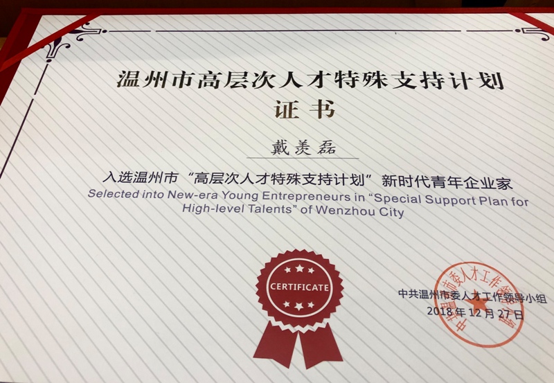 在此次大會(huì)上,我公司總經(jīng)理:戴羨磊先生,應(yīng)邀參加會(huì)議,并榮獲溫州市“高層次人才特殊支持計(jì)劃”新時(shí)代青年企業(yè)家殊榮。