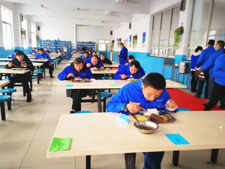 在復(fù)工期間,錦峰紡機(jī)變更一系列工作方式,將食堂和工位,嚴(yán)格做到錯(cuò)號(hào)單向隔坐,禁止交頭接耳。